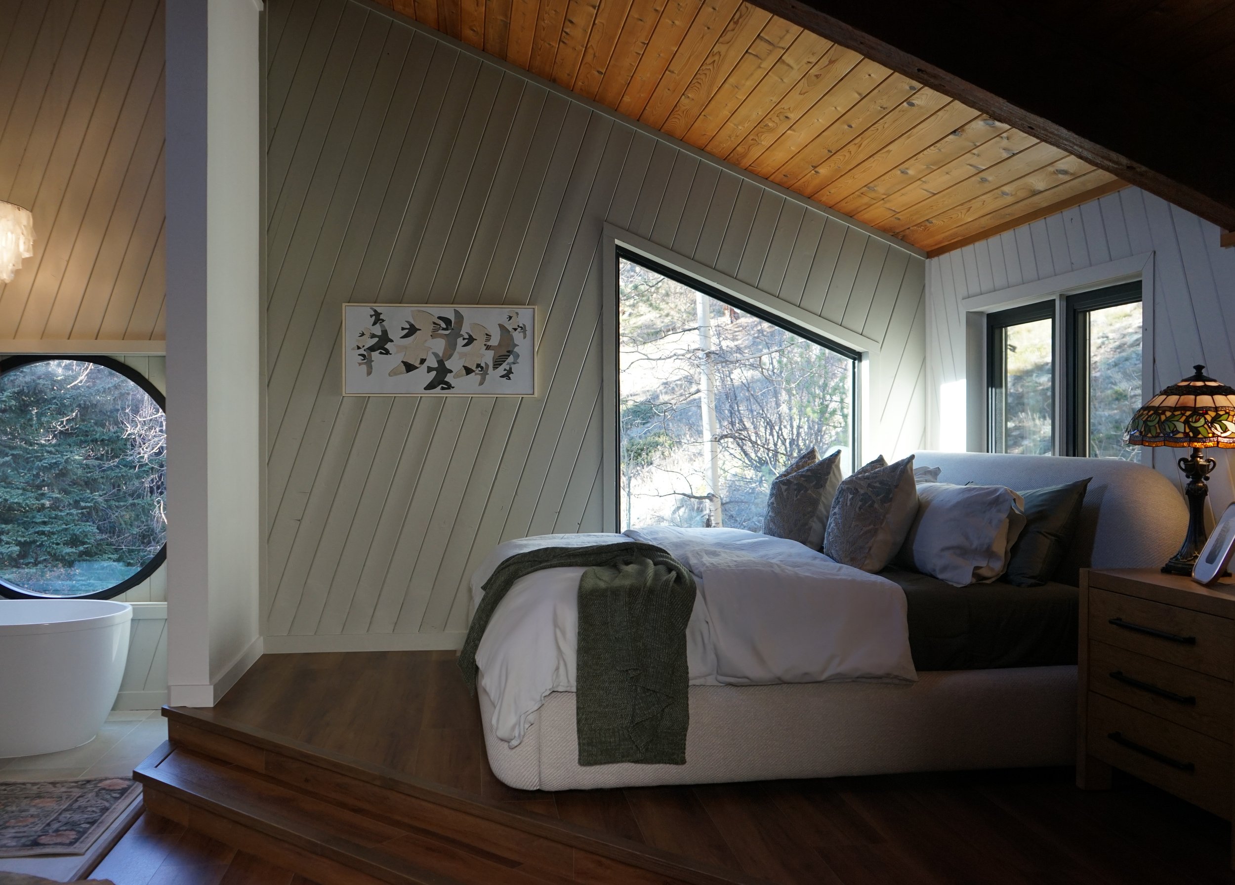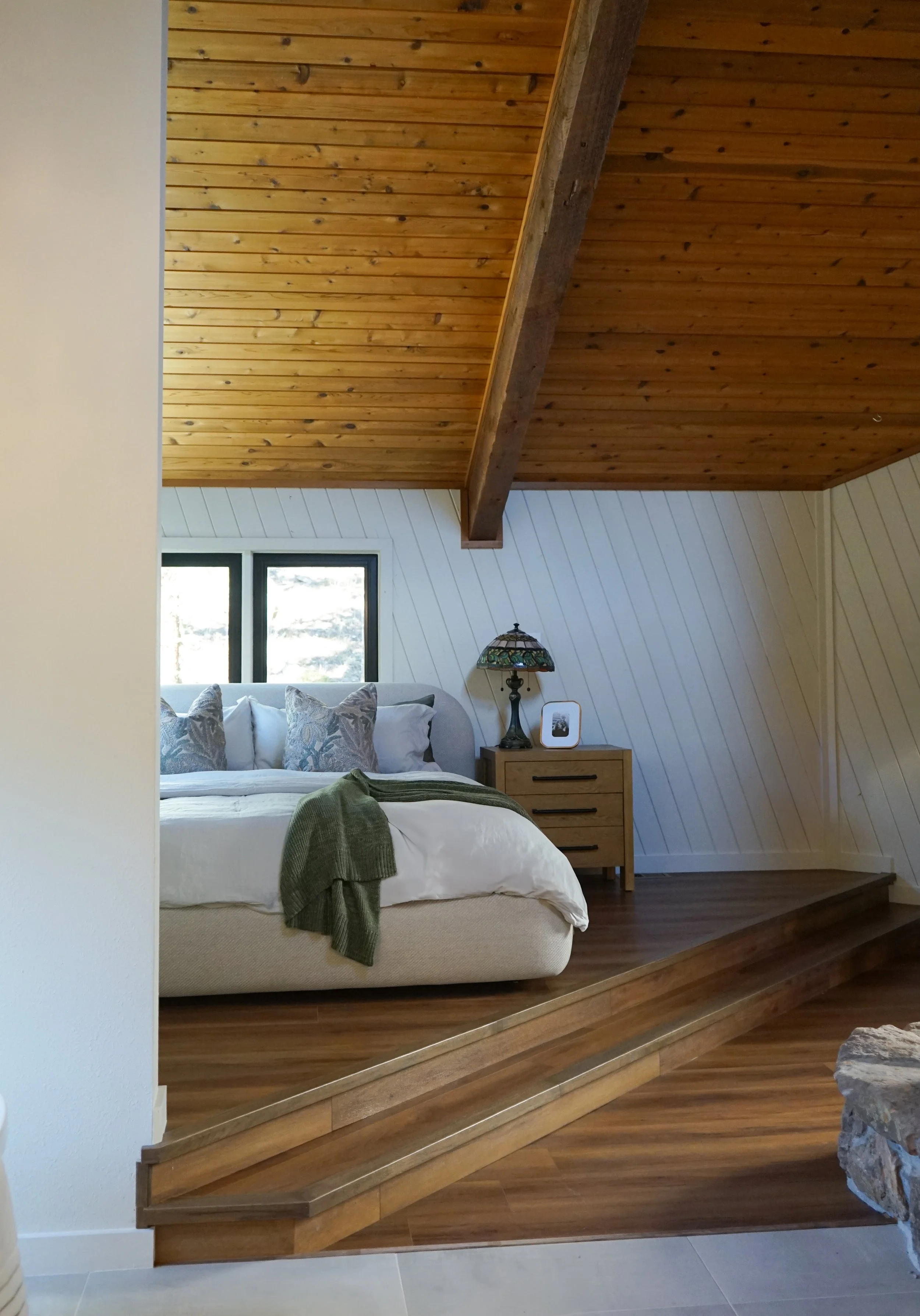 The elevated sleeping area creates a gentle sense of retreat. Warm wood ceilings, layered neutrals, and thoughtful architectural details help the space feel grounded, peaceful, and intentionally restorative.